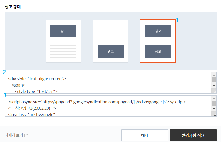 광고 형태에서 맨 우측에 있는 (1)위아래 광고가 들어가는 것을 선택해주신 후,