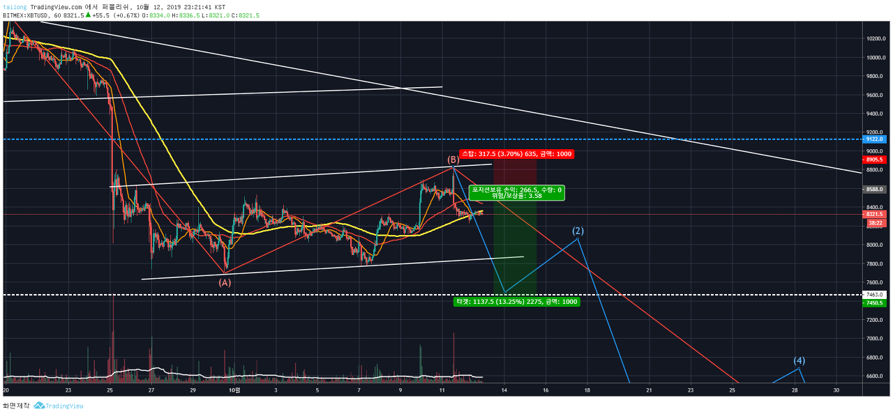 19년 10월 12일 비트코인 시세 전망 분석을 하겠습니다. 가격이 폭락 후 반등 중에 있습니다.
