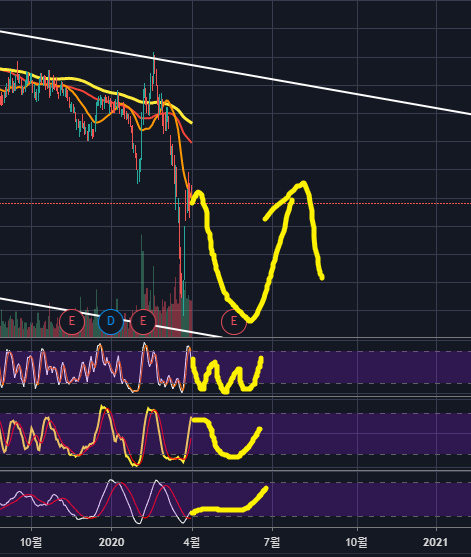 이렇게 한개의 거대한 파동이 종료된다면 W파동정도까지 상승할 수 있어보이네요.
