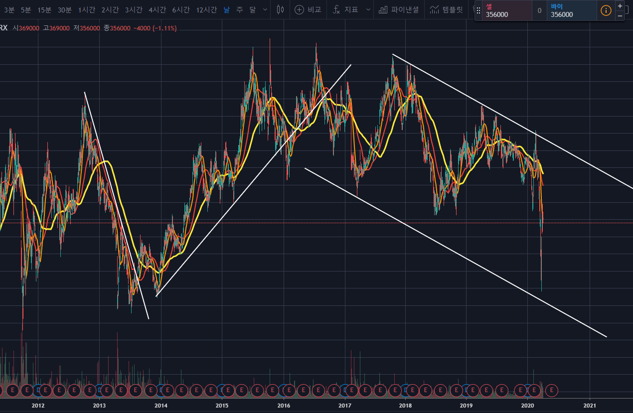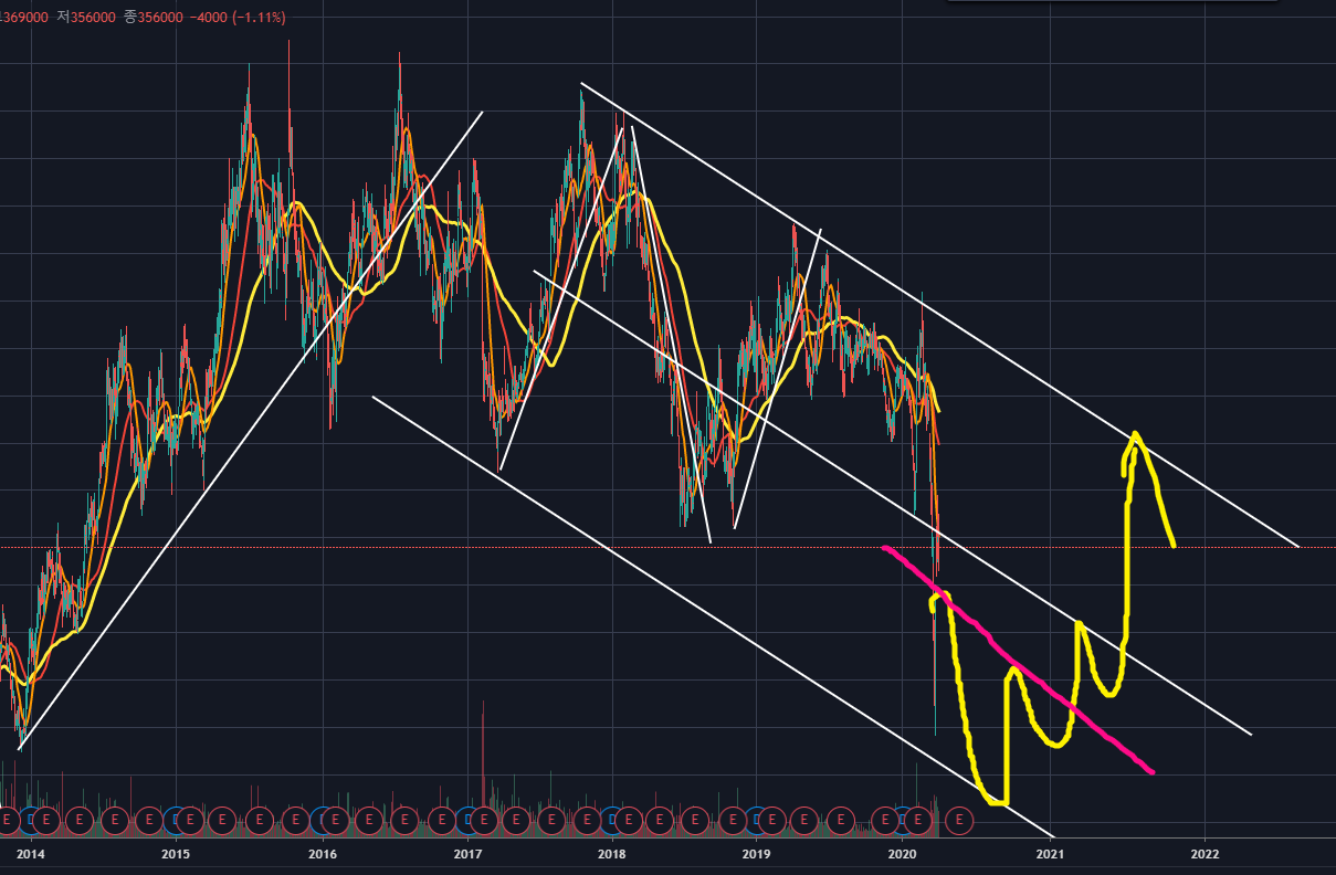 우측에 보면 큰 하락채널링이 식별됩니다. 지금 고려아연의 주가는 하락채널링의 하단선과 근접해있네요.