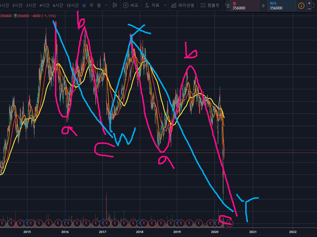 물론 중간중간 진폭이 크게 박스권을 형성하긴 하였지만, 결국 고점과 저점이 낮아졌다는 것을 보면 하락이 진행되고 있다는 것을 확인할 수 있네요.