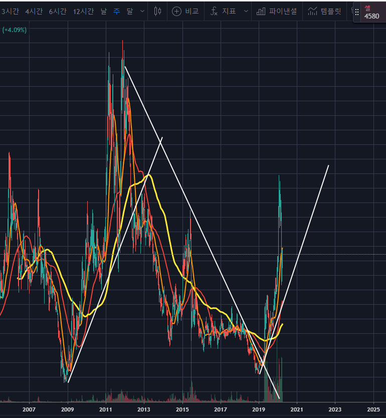 SFA반도체의 주봉차트를 보면 2009년 저점이후 2012년까지 10배 올랐습니다.