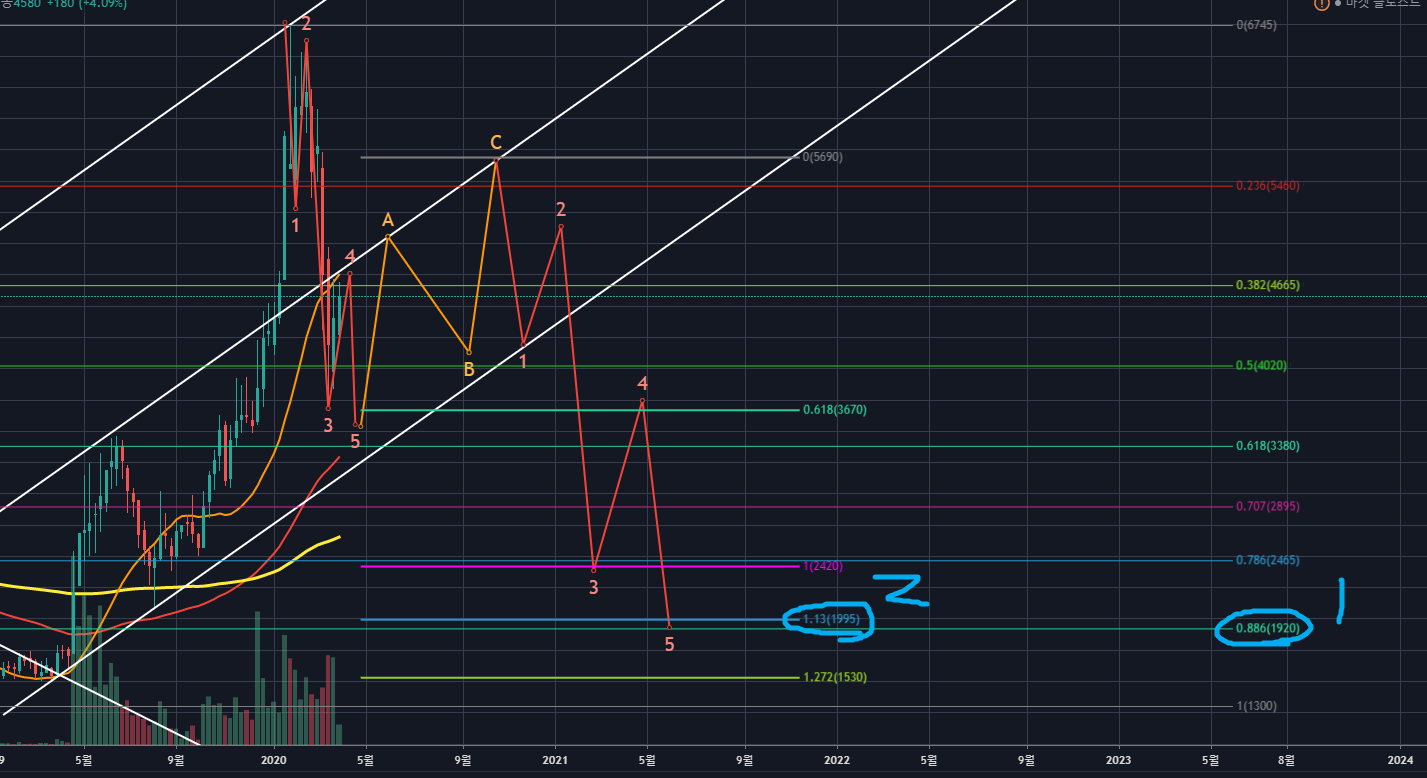 엘리어트파동이론의 관점에서 보면, 지금 ABC조정이 535지그재그로 나오는 것으로 보이며