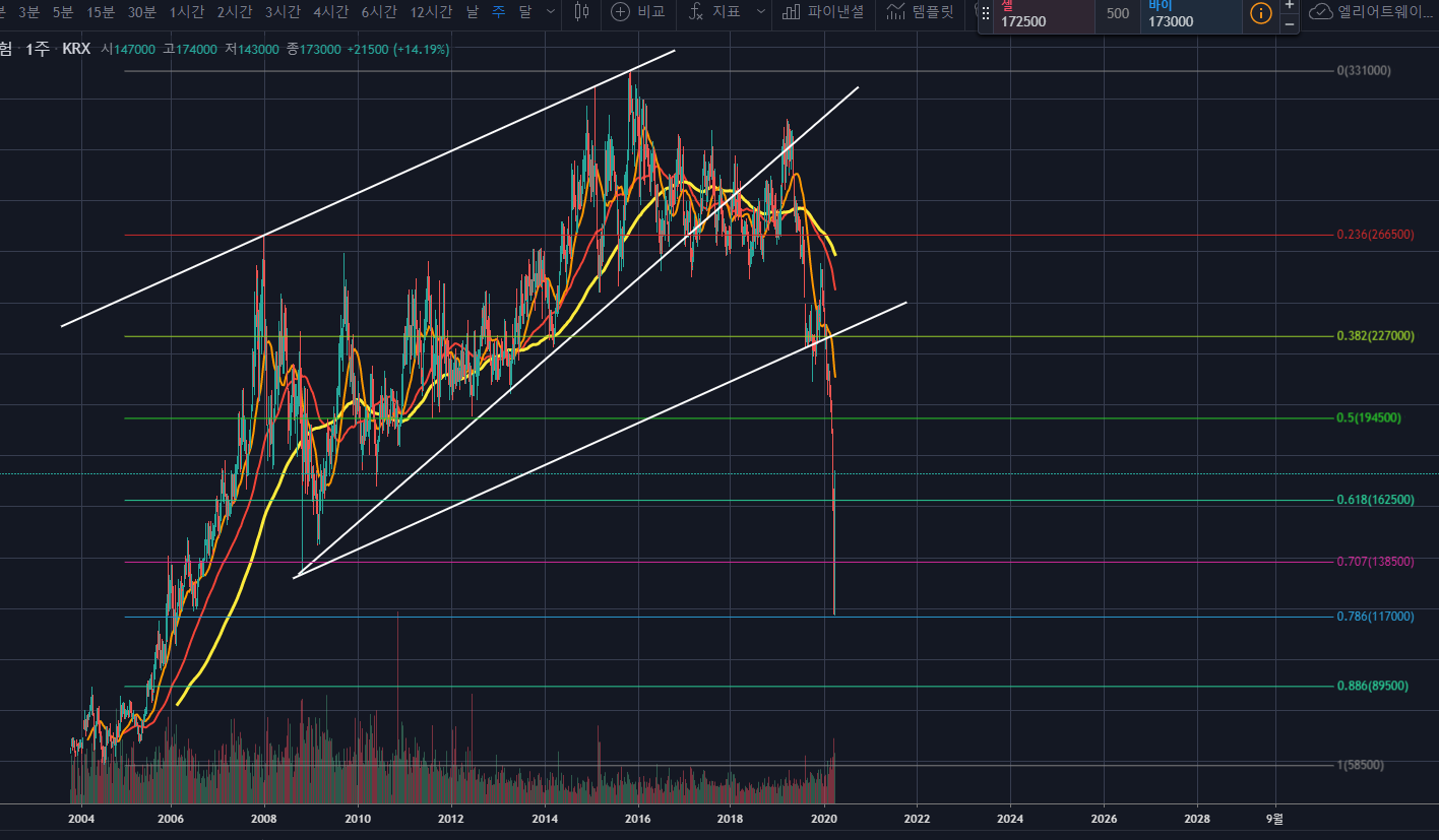 삼성화재 주봉차트를 보면, 큰 라이징웻지를 만든 후 하락하고 있는 모습입니다.
