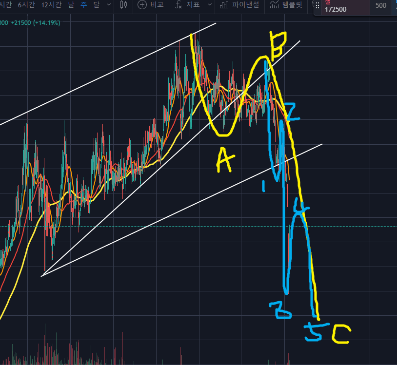 엘리엇웨이브를 굳이 보자면,위의 노락색 ABC 파동이 나오는 것 같으며, 지금은 C파동의 하위파동 파란색 3파까지 나오고 4파 되돌림 중으로 보입니다.