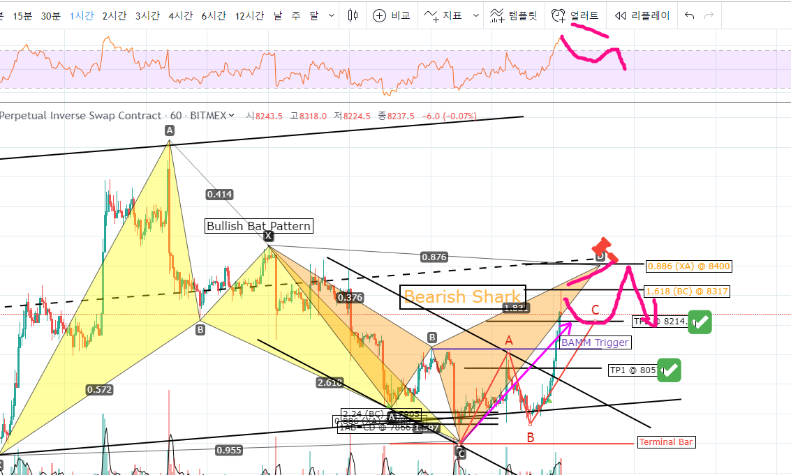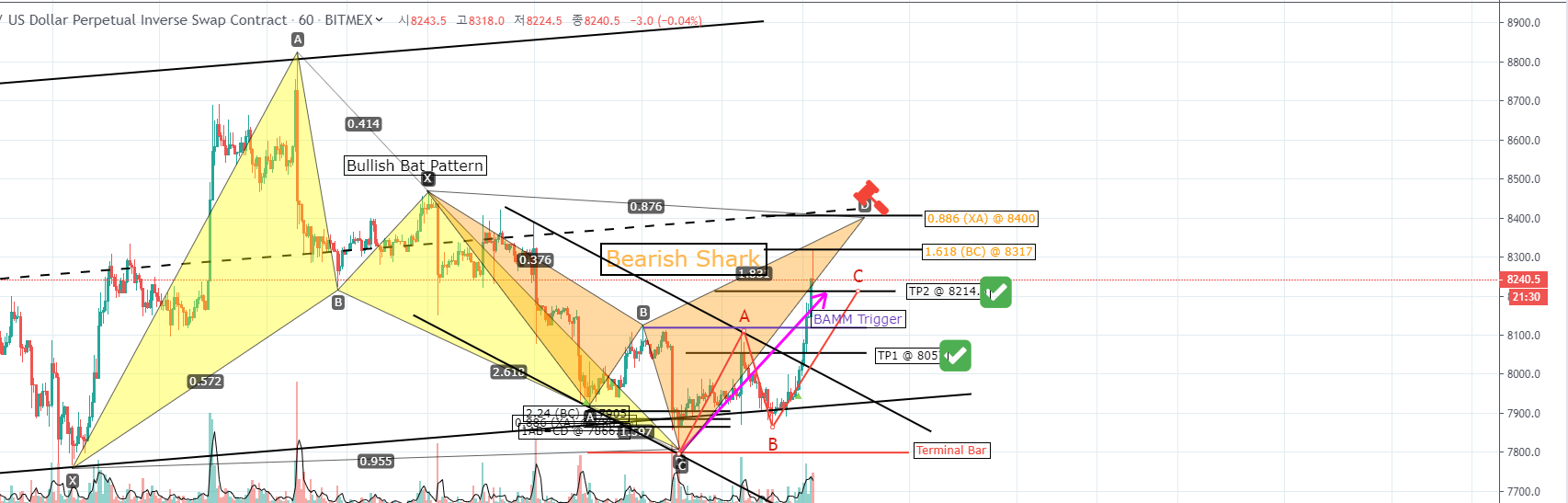 가지고 있는 나머지 포지션은 매도 상어 패턴(Bearish Shark Pattern)의 PRZ 중 하나인 0.886 (XA) 8400에서 순차적 스위칭 예정입니다.
