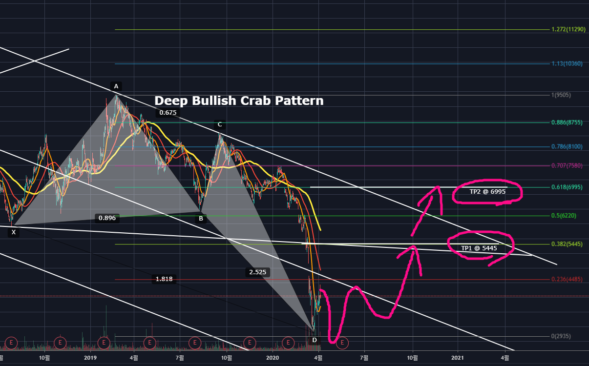 4시간 봉 일반상승다이버전스, 스토캐스틱호전, Deep Bullish Crab Pattern PRZ테스트 등의 적용을 받아서 꽤나 큰 상승을 할 것 같네요.