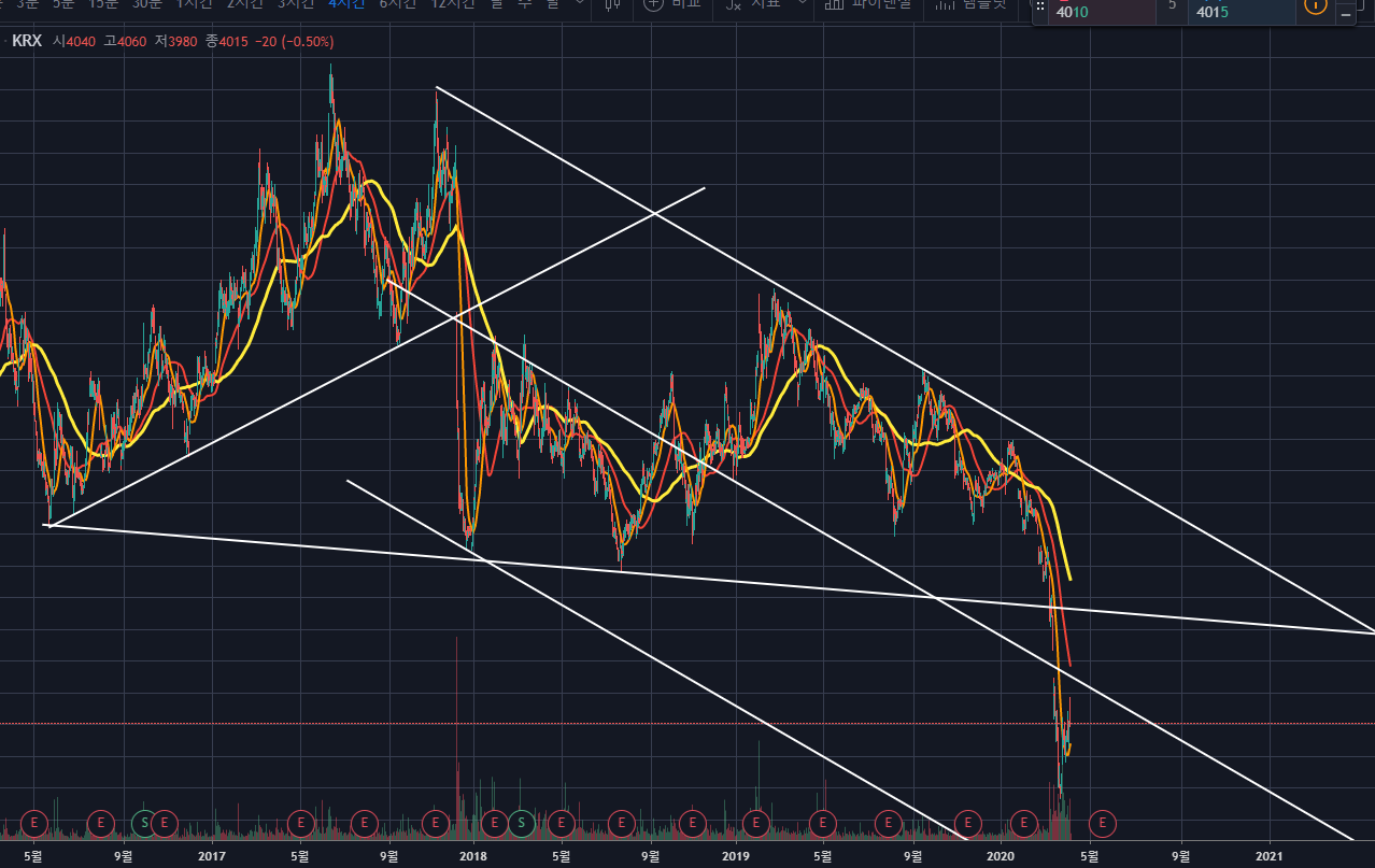 위의 차트를 보면, 하락채널링과 수렴 등 여러가지 추세선이 이어지는 복잡한 모습을 보여주고 있습니다.