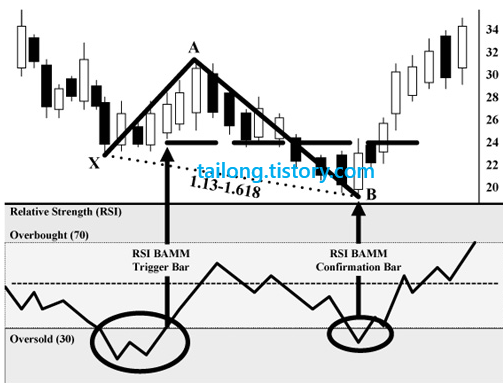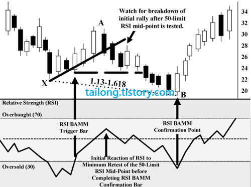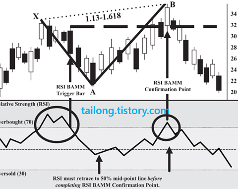 Bullish RSI BAMM의 경우 X의 자리에서 RSI는 30이하의 과매도 구간에 들어서야 하며, 주가가 A자리로 향하면서 RSI도 과매도권을 벗어나 RSI 50을 경유해야합니다. 이후 B로 향할 때 RSI가 다시 30이하 과매도구간에 덜어지지만,
