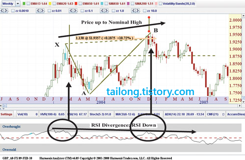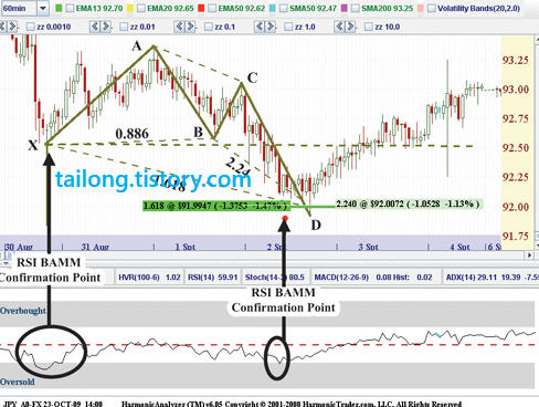 위의 그림만 봐도 하모닉 패턴을 배우신 분은 금방 이해하실 것입니다. X포인트와 D포인트가 RSI BAMM이 형성되면서 일반상승다이버전스가 생성된 모습입니다. 따로 더 설명할 것이 없어 보이네요.