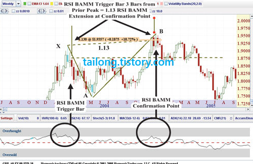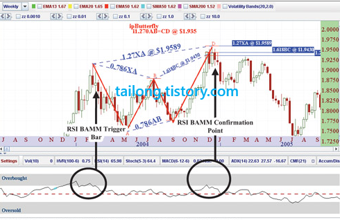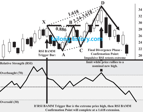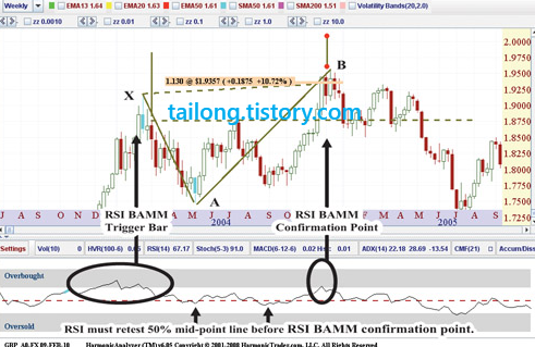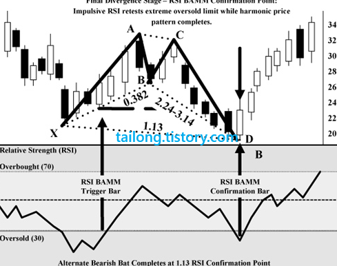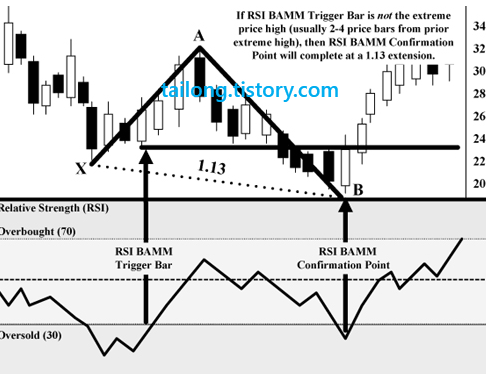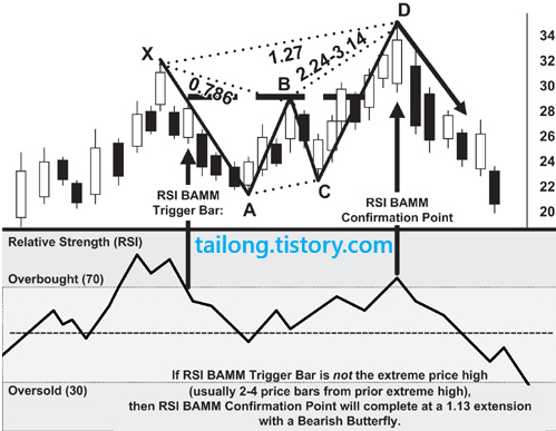 RSI BAMM에서 RSI를 읽는 것과 하모닉 패턴의 완성은 매우 정확한 기술적 구간을 결정하고, 불확실한 이전 트렌드를 판독할 수 있는 향상된 방법입니다. RSI BAMM은 하모닉 패턴의 지지와 저항 구간을 결정하기에 매우 정확합니다. RSI BAMM은 기술적 분석에서 전례 없는 응용방법입니다. 비록 RSI BAMM이 사용되려면 많은 기술적 조건이 요구되지만, 이 방법으로 패턴이 완성된다면 의미있는 매매 시그널과 개연성 있는 미래 가격 움직임의 정확한 증거를 미리 제공해줍니다.