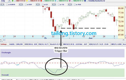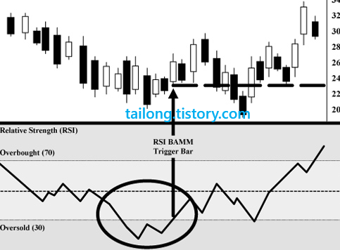 이럴 경우 X의 지점에서 RSI가 최초 30이하로 내려갔다가 30이상으로 올라올 때를 RSI BAMM Trigger Bar라고 하며,