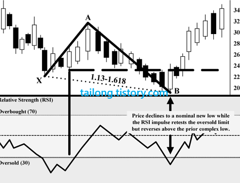 주가가 계속해서 하락하다가 RSI 30이하 과매도권 진입->RSI 50을 회복하며 주가가 반등->주가가 X의 저점을 하향돌파하지만 RSI는 이전 저점을 깨지 않은 상태에서 30이하 과매도권에 진입하게 된다면 강한 반등의 신호입니다.