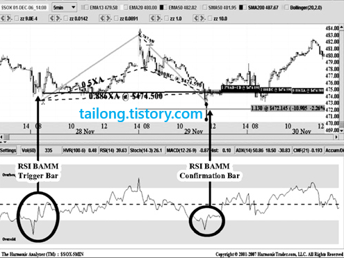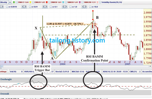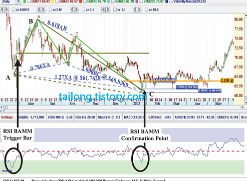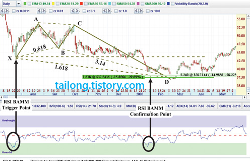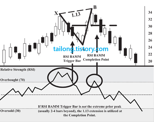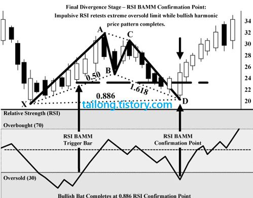 위는 책에서 나온 예시인데, D지점이 0.886(XA)를 초과하고 X지점도 초과하였으므로 제가 보기엔 패턴이 무너진 것으로 보이지만 책에 실려있기 때문에 소개합니다. 0.5B포인트 후 0.886(XA)의 Bat Pattern을 적용하려고 했다면 X포인트를 주가가 깨는 순간 패턴이 무효화 되는 것을 인지하시고 보시길 바랍니다. 이것은 단지 RSI BAMM에 대한 설명일 뿐이므로 RSI BAMM의 작동원리에만 집중해주세요.