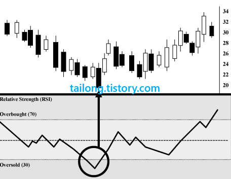 위의 그림도 RSI가 30이상으로 회귀할 때의 캔들 저점에서 가격이 지지를 받고 반등한 것을 볼 수있습니다.