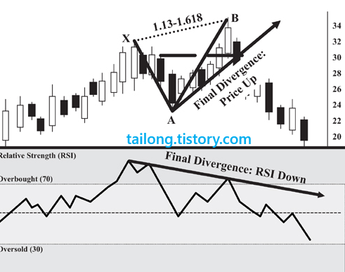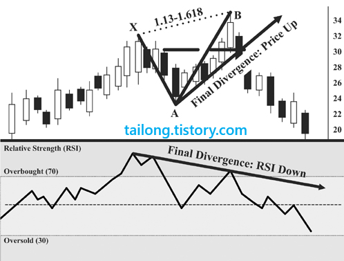 위의 그림도 X지점에서 RSI가 30이하 과매도권에 진입하였다가 빠른 반등을 하였으며, 가격이 하락함에도 RSI지표는 안정화되어 하락하지 않다가 주가가 저점을 갱신할 때 RSI가 일반 상승다이버전스를 만들면서 하모닉패턴과 RSI BAMM을 충족시켜 가격이 상승반전한 모습을 보여줍니다.