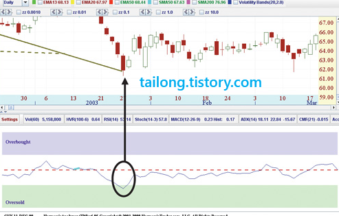 최초 가격이 급격한 움직임을 보일 때 RSI가 과매도(30), 과매수(70)권에 들어선 후,