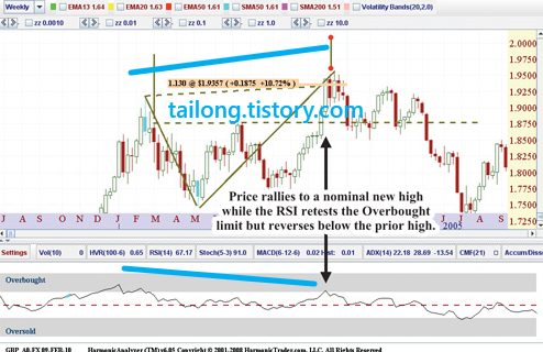 강력한 주가 움직임이 일어난 후 다이버전스가 생성되었을 때에는 추세전환이 임박했다는 아주 강한 신호입니다.