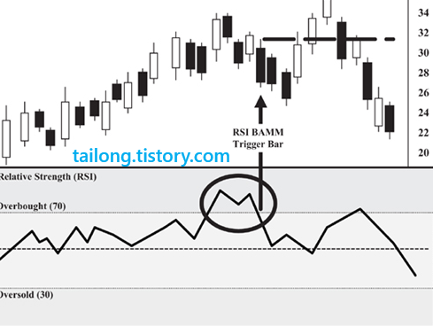 이럴 경우 X의 지점에서 RSI가 최초 30이하로 내려갔다가 30이상으로 올라올 때를 RSI BAMM Trigger Bar라고 하며,