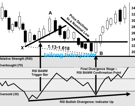최초 가격이 급락하면서 과매도 30이하로 진입, 이후 빠른 반등, 이후 상승하면서 RSI를 50이상으로 회복하다가 가격이 추세선 하향이탈, 이후 RSI BAMM Trigger Bar에서 주가가 지지, 이후 가격은 저점을 갱신했지만 RSI 저점은 높아진 상태의 일반상승다이버전스의 순으로 RSI BAMM은 발현되며, 급격한 상승을 예측할 수 있다고 합니다.