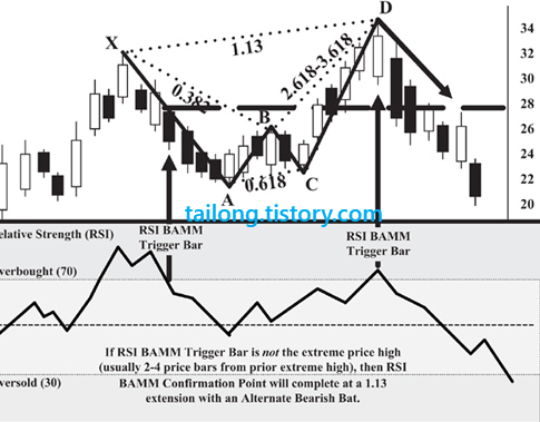 위는 책에서 나온 예시인데, D지점이 0.886(XA)를 초과하고 X지점도 초과하였으므로 제가 보기엔 패턴이 무너진 것으로 보이지만 책에 실려있기 때문에 소개합니다. 0.5B포인트 후 0.886(XA)의 Bat Pattern을 적용하려고 했다면 X포인트를 주가가 깨는 순간 패턴이 무효화 되는 것을 인지하시고 보시길 바랍니다. 이것은 단지 RSI BAMM에 대한 설명일 뿐이므로 RSI BAMM의 작동원리에만 집중해주세요.