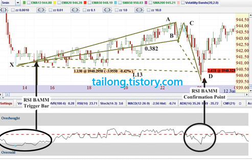 위의 그림만 봐도 하모닉 패턴을 배우신 분은 금방 이해하실 것입니다. X포인트와 D포인트가 RSI BAMM이 형성되면서 일반상승다이버전스가 생성된 모습입니다. 따로 더 설명할 것이 없어 보이네요.