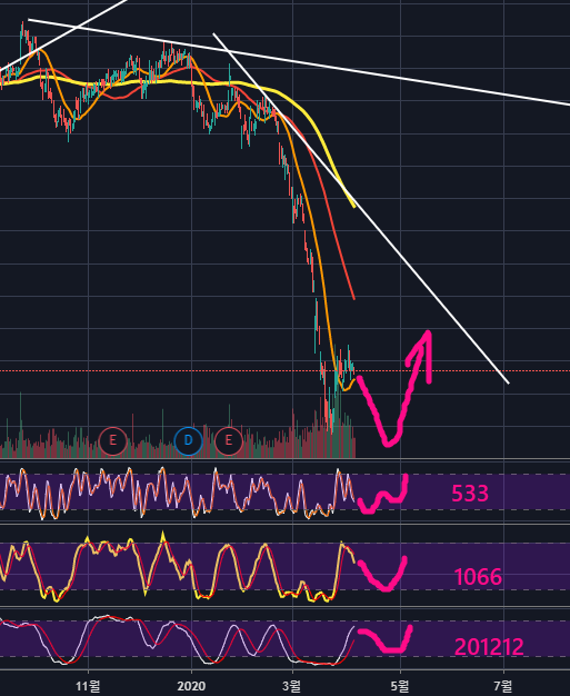 기아자동차의 주가는, 반전이 임박해 보이네요. 여러 툴을 짜맞춘 것으로도 볼 수 있지만, 예측한대로 주가가 움직이면 매매에 임하면 되는 것이고, 예측한 대로 나오지 않는다면 다른 종목을 찾으면 그만입니다. 종목은 많은데 너무 한 종목에 꽂혀있기 보다는, 자신이 잘 아는 방법으로 매매를 이어나가는 것이 좋아보입니다.
