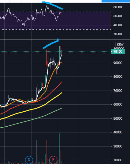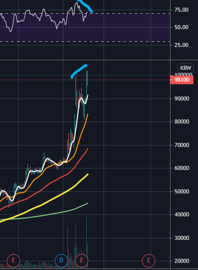 20년 4월 4일 20,600원대의 주가는, 21년 2월 3일 102,000원의 고점을 찍은 후 21년 2월 4일 98,100원으로 조정을 준 상태입니다. 보시면 알겠지만 4시간 봉에서 정배열로 상승하였으며, 현재구간은 이평들간의 이격이 매우 큽니다.