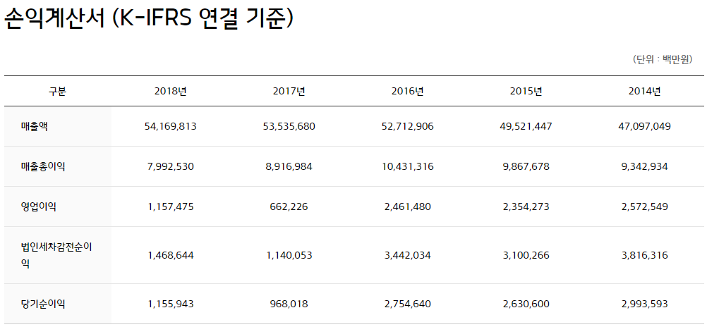 매출액 증가분대비 당기순이익은 전년대비 증가하였지만, 2014년~2016에 비해서는 1/2수준도 되지 못하네요.