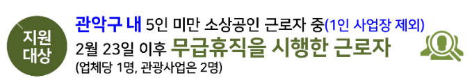 관악구 내 5인 미만 소상공인 근로자 중(1인 사업장 제외) 2월 23일 이후 무급휴직을 시행한 근로자(업체당 1명, 관광사업은 2명)