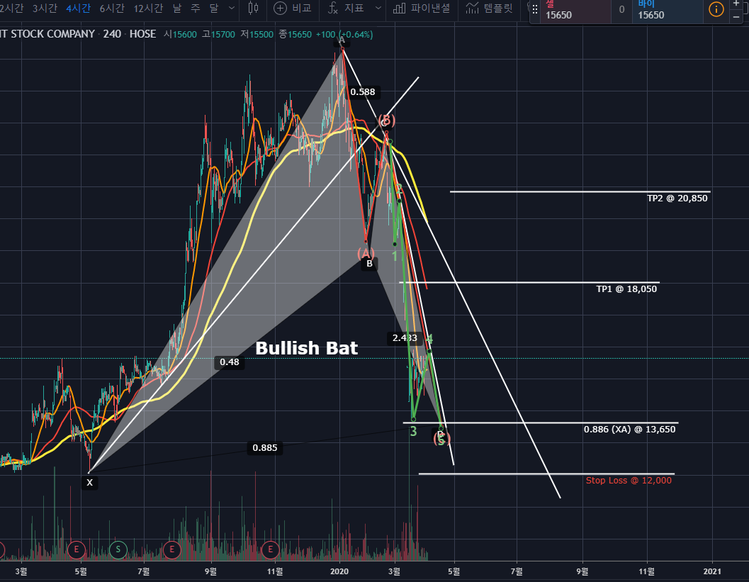 HDC를 보니 Bullish Bat Pattern(매수 박쥐 패턴)이 나오려고 하네요. 0.886 (XA) 바로 전에서 RSI가 과매도권에 들어선 후 튕긴 모습이 딱 0.886(XA)의 PRZ를 테스트 한다면 반등을 하려고 기다리는 것 같습니다.