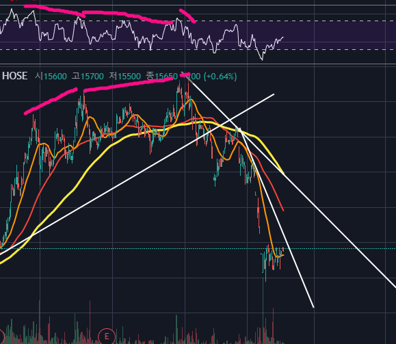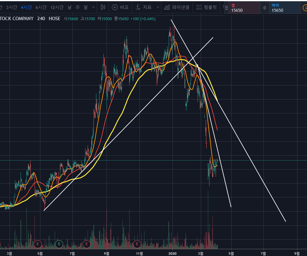 HDC 4시간 봉을 보면, 2019년 이후 이어져오던 상승채널링을 하향돌파하며 급격한 하락이 진행되었습니다.