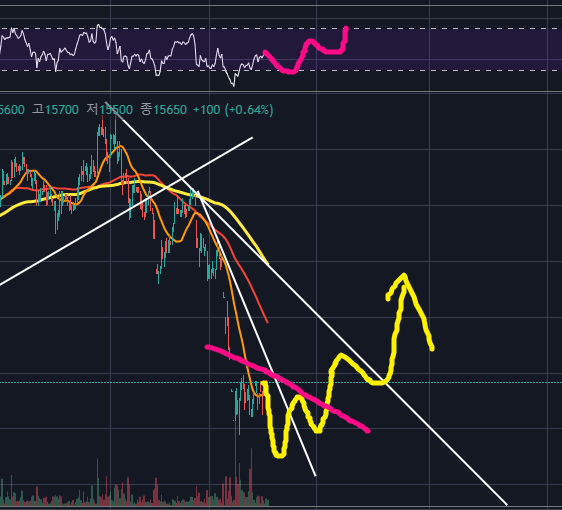 위의 그림과 같이, 저점을 낮춘 후 가속하락추세선을 상향돌파한 후, 재차 눌림-> 이후 상승하게 된다면 역헤드앤숄더가 만들어지며 상승할 것 같습니다. 이때 RSI 는 위와 같이 점점 저점을 높여가는 모습이 나올 것이구요.