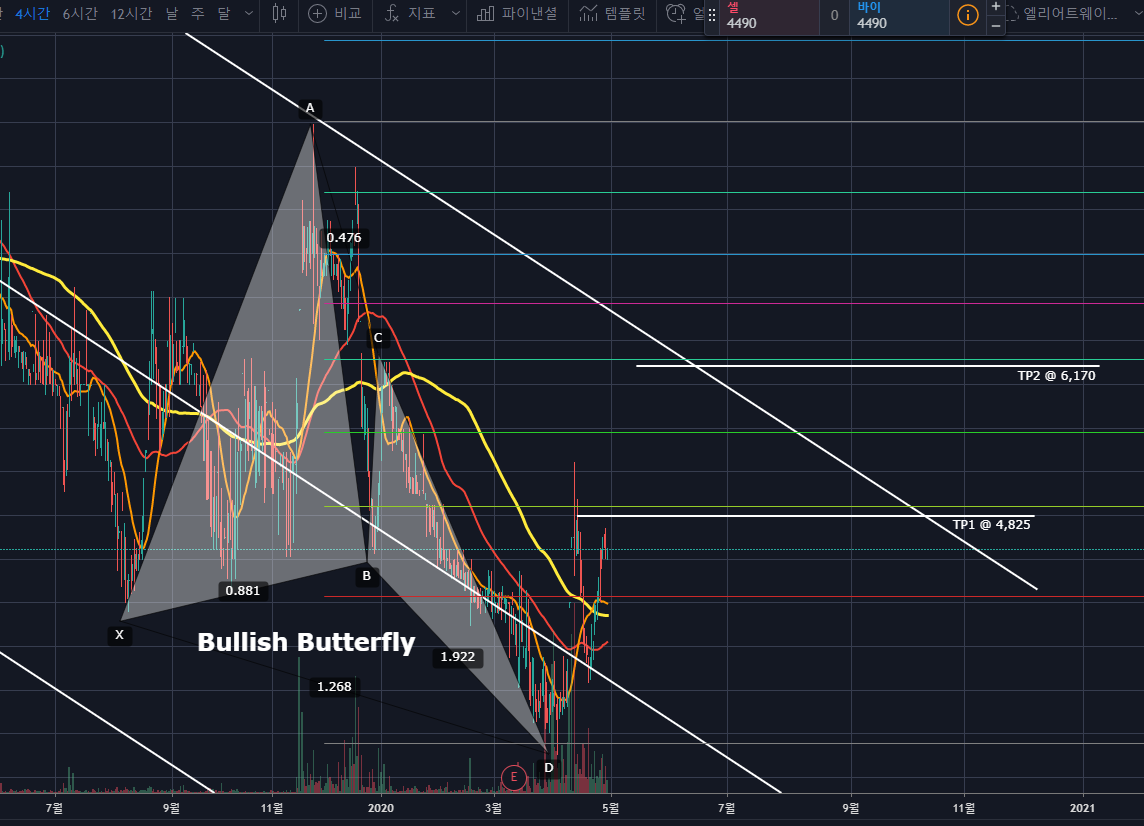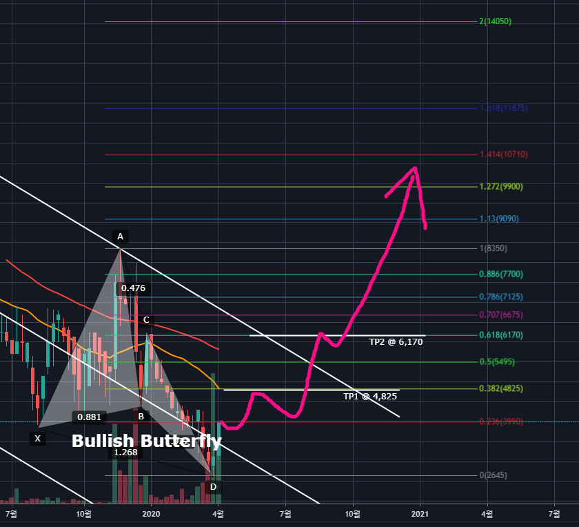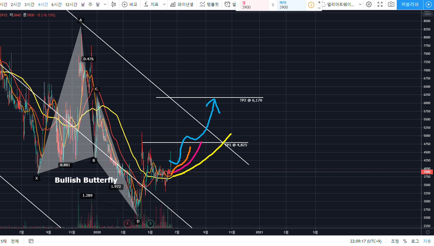 50%의 물량은 TP2부근에 간다면 본절바로위로 스탑로스를 올려가면서 계속 추적해가세요. 아마 2021년 전까지, 혹은 2021년까지도 상승세가 이어질 수 있어보이네요. 시간이 경과한 후의 차트를 봐야겠지만, 지금은 차트가 좋네요.