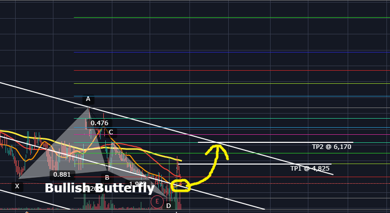 TP1에서 50%의 물량을 익절매 하는 것이 좋습니다. 그런 후 남은 물량은 Bullish Butterfly PRZ를 강하게 거래량을 가지고 하락이탈하지 않는다면 하락하더라도 홀딩하는 것이 좋습니다.