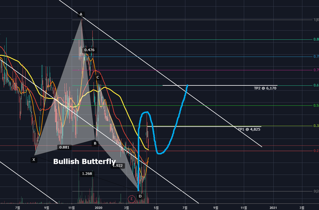 Bullish Butterfly TP2인 6,170원까지의 상승은 빠르게 올 것으로 보입니다.