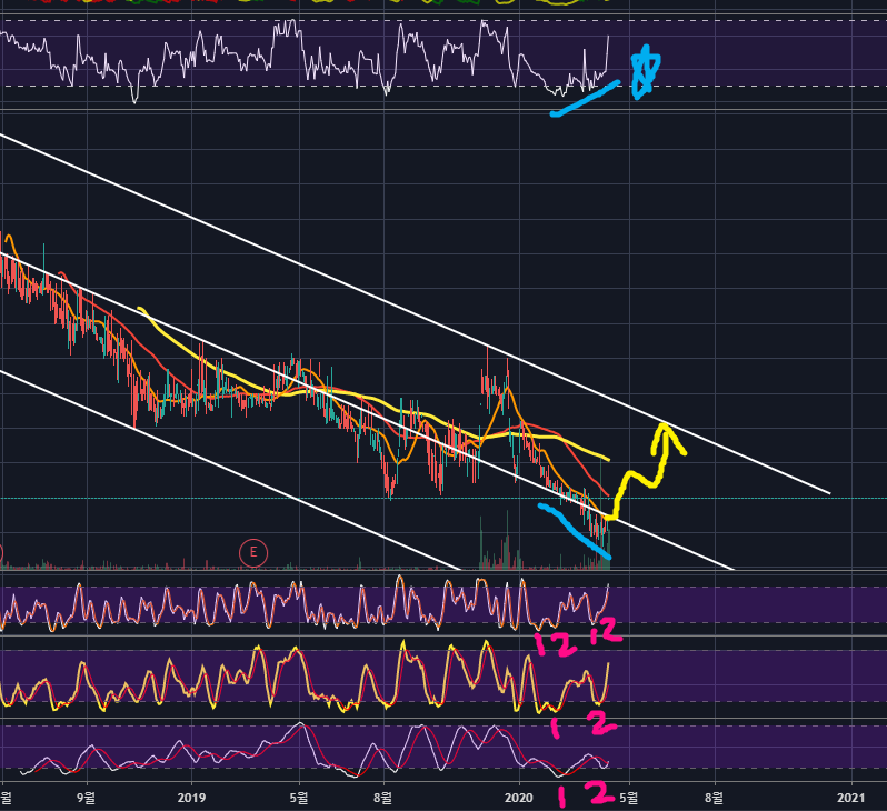 큰 하락 채널링을 만들며 하락하던 주가는, 이제 하락피로도와 상승압력에 못이겨서 곧 추세전환을 할 것 같습니다. 하락추세선의 제일 상단 저항을 뚫는 순간 주가가 얼마나 오를지 예상도 안되네요. 차트가 상당히 좋습니다.