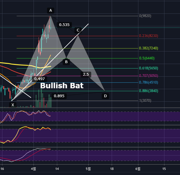 현재 하모닉패턴을 근거로한 움직임이 나오지 않았습니다. 하지만 추세선, 이평, 다이버전스, 스토캐스틱 등을 고려하였을 때,