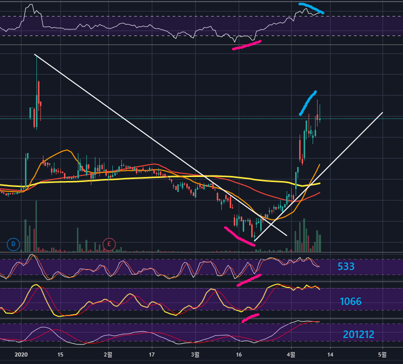빨간색 RSI와 스토캐스틱 일반 상승다이버전스 적용 후, 하락하는 추세선을 강하게 돌파하면서 급등이 나온 형태입니다.