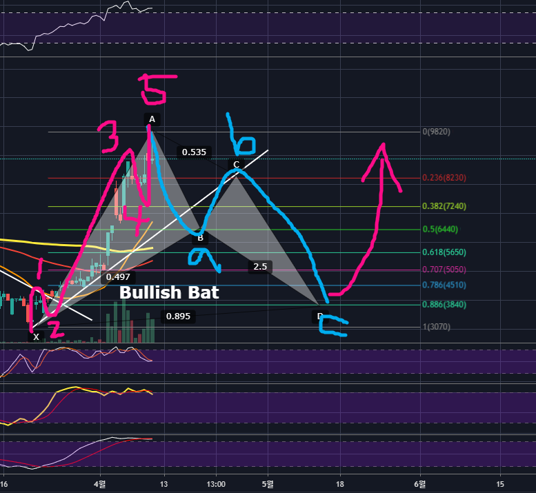 이런 모양에서는 Bullish Bat Pattern(매수 박쥐 패턴) 모양이 많이 나오곤 했습니다.