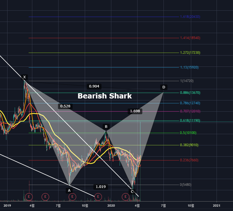 이번 상승은 Bearish Shark Pattern의 0.886(XA)혹은 1.13(XA)에서 PRZ를 구성 후 조정이 나올 것 같습니다.