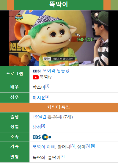 뚝딱이는 도깨비를 모티브로 만들어진 캐릭터로, 1996년 5월 EBS 프로드램 '딩동댕 유치원'에서 처음 나온 캐릭입니다.
