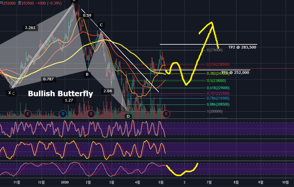 Bullish Butterfly Pattern의 TP2까지 상승하기보다는 지금 이자리에서 이번 한 파동의 큰 상승이 종결되고 조정이 나올 것 같습니다.