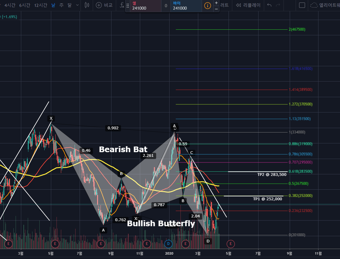 신세계 주가가 하모닉 패턴 Bullish Butterfly에서 PRZ반전 후 TP1에 도달하였습니다. 50%이 익절되어있는 상태여야 하며,