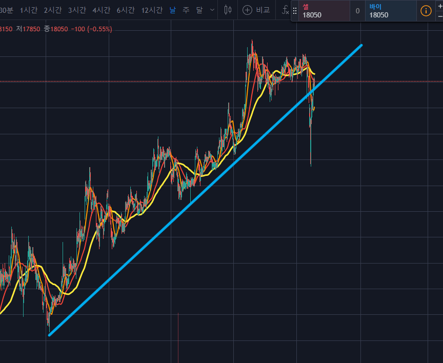 주봉을 보면 노란색 120이평을 따라가다가, 크게 깬 후 반등한 모습이기도하네요.