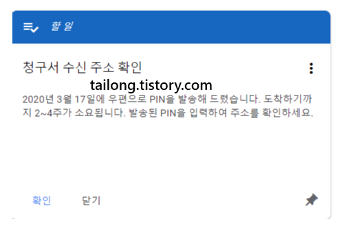 퇴근하고보니, 우편함에 낯선 종이 두 장이 있어서 무엇이지?하고 봤는데 웬걸... 기다리던 핀번호라 너무 기뻤습니다.