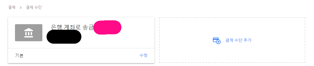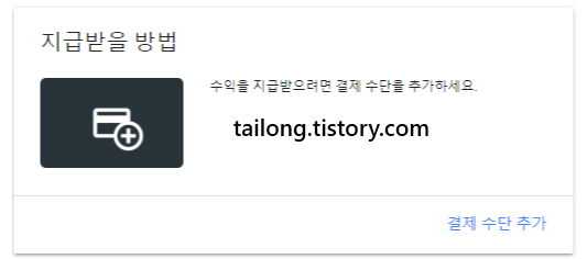 위의 그림과 같이 애드센스 좌측에 지급이란 것을 누르시면, 지급받을 방법이라는 카드모양의 섹션이 나옵니다. 이곳에 있는 결제 수단 추가를 눌러주세요.