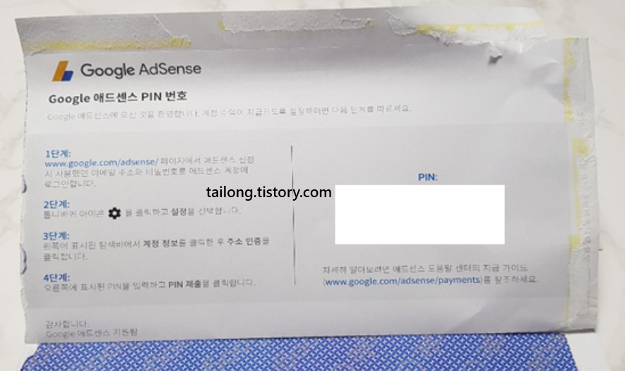 이렇게 핀번호가 왔으니, 애드센스에 들어가서 입력해볼까요?