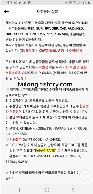 여기에서 해외에서 카카오뱅크 입출금 계좌로 송금 받으려면 어떻게 해야 하나요?를 클릭해주면 아래와 같은 문구가 나옵니다.