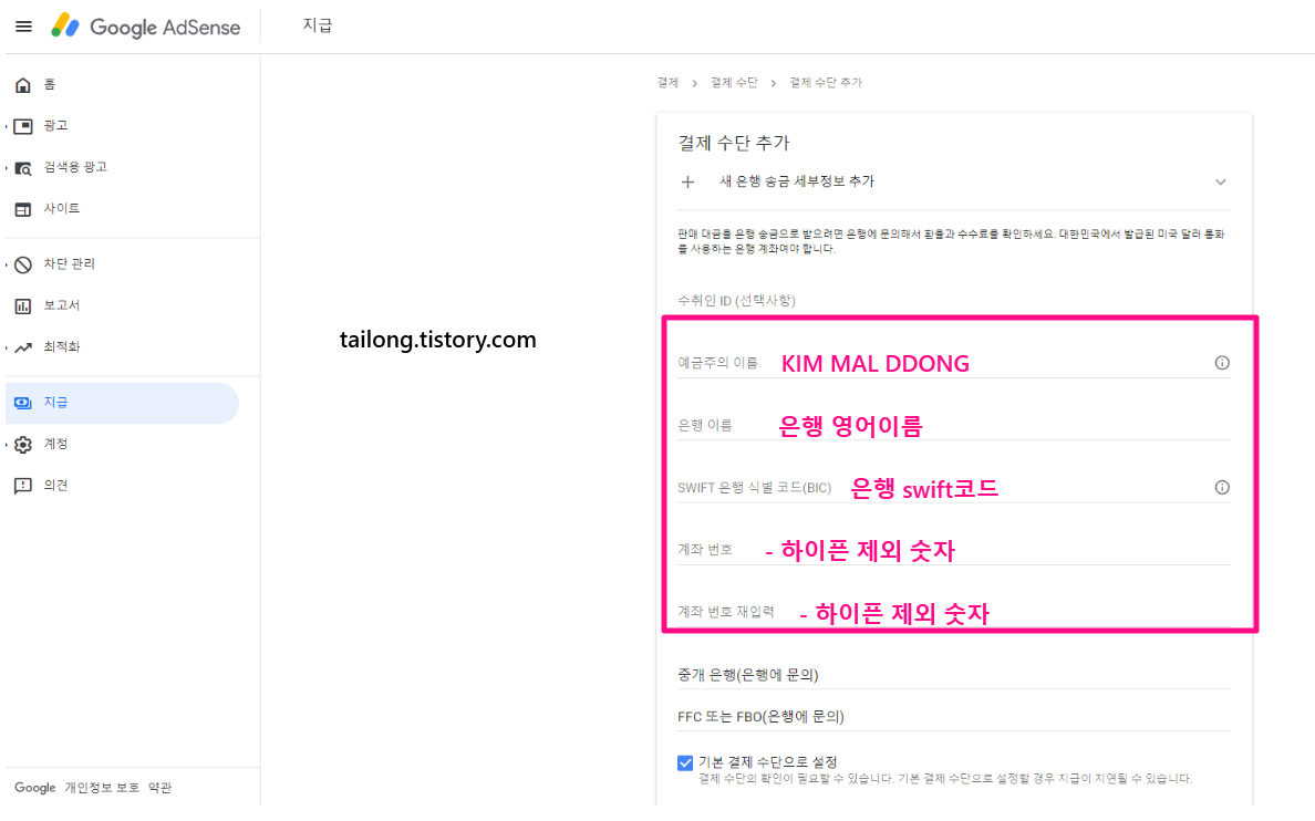 저와 같이 카카오뱅크를 지급수단에 추가하시려면 위의 내용대로 Swift code와 은행명, 은행 주소를 입력해주시면 됩니다. 그리고 하이픈 -을 제외한 계좌번호를 입력해주면 끝!